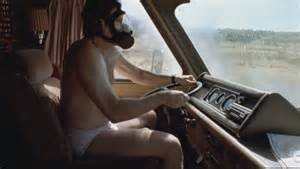 Here’s a description of that dramatic opening shot: A man (Bryan Cranston) wearing only underpants and a gas mask, drives a Bounder RV recklessly down a desolate road in the New Mexico desert. Another, younger man (Aaron Paul) with a gas mask covering a severely bruised face, unconscious, occupies the passenger seat. As the vehicle swerves down the dirt road, two bodies slide across the RV floor until the vehicle veers into a ditch. The hyperventilating driver climbs out with a video camera, wallet, and gun. Identifying himself as Walter Hartwell White, he records a cryptic, handheld farewell to his wife, son, and unborn child while sirens echo in the distance. Walt then steps onto the roadway, with the gun in his hand.